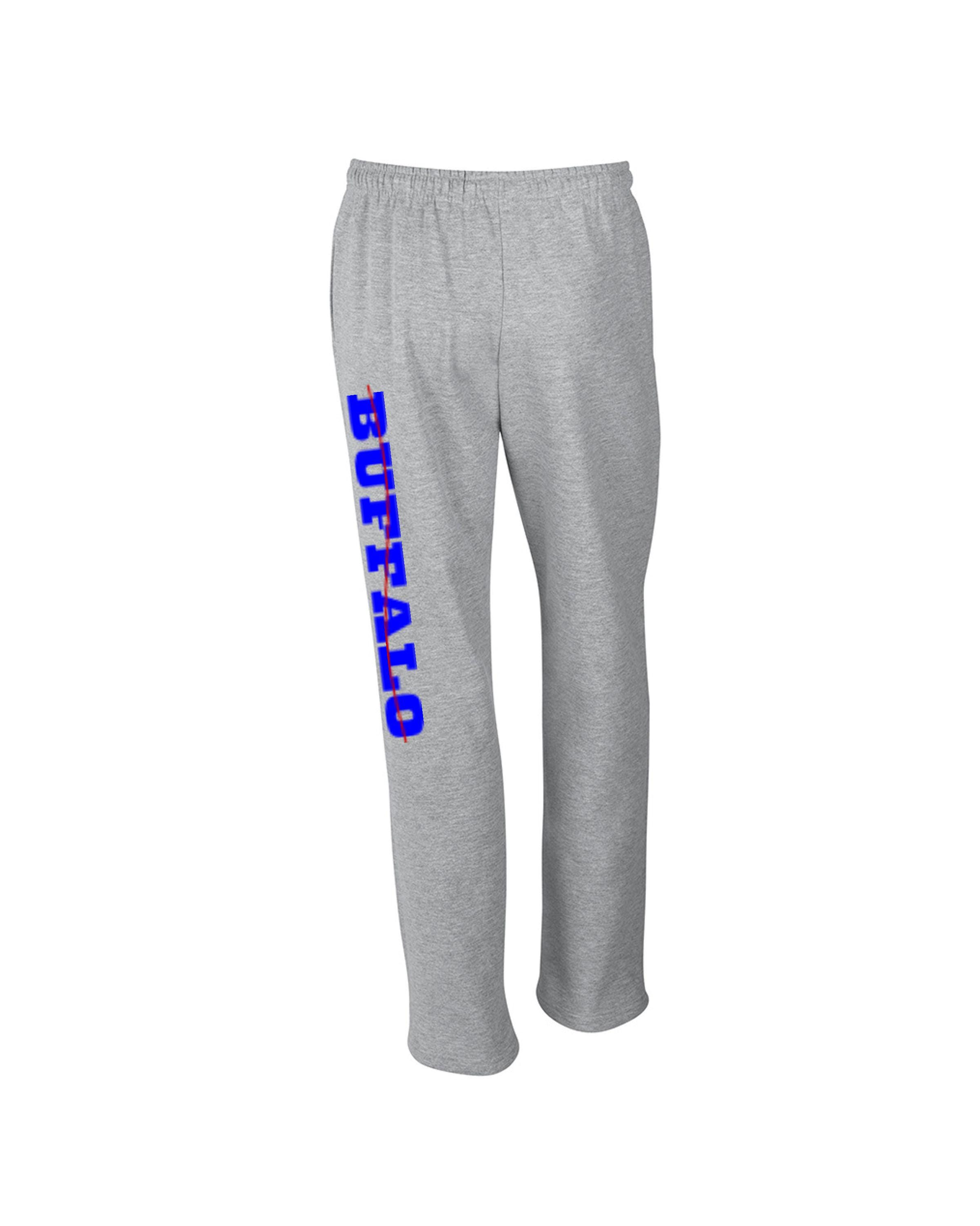 A great quality pair of fleece sweatpants for the male of any age. 7.8 oz. - 50% cotton 50% polyester - jersey lined side seamed pockets - covered elastic waistband with draw cord - open bottom legs - sizes small thru xx-large available. Size Small (Waist 29"-31" Inseam 31") Medium (Waist 32"-34" Inseam 32") Large (Waist 35"-37" Inseam 32") X-Large (Waist 38"-40" Inseam 33") XX-Large (Waist 41"-43" Inseam 33.5"). A perfect pair of sweatpants for the Buffalo fan !!!